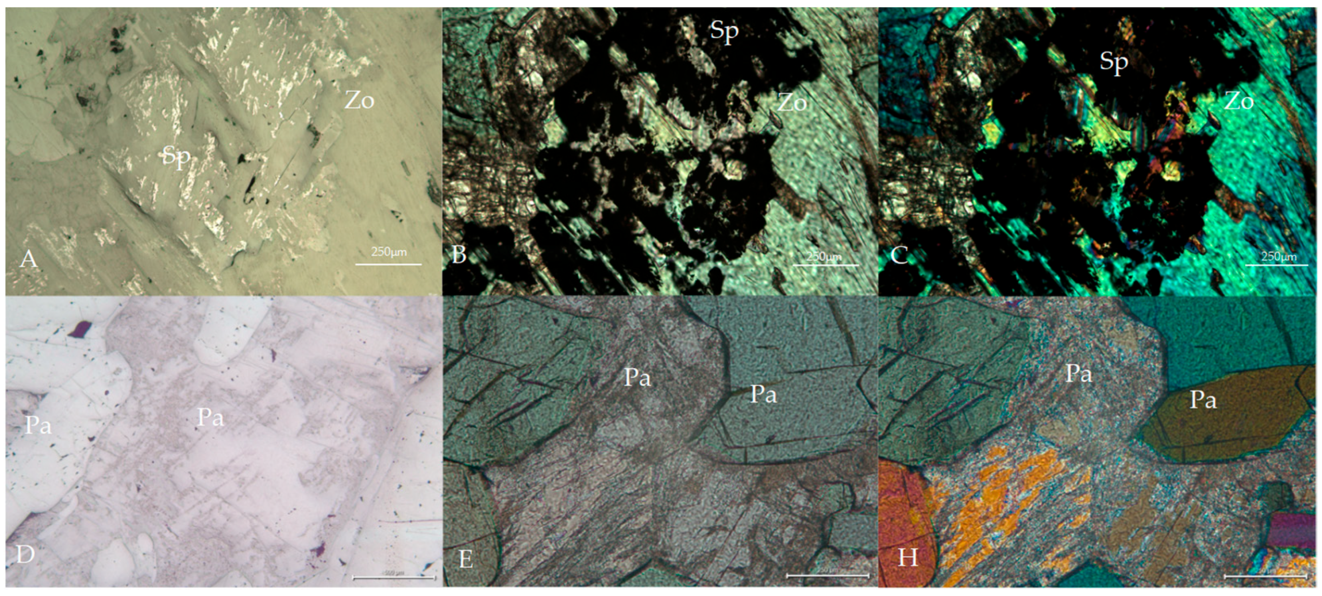 | Margarite | - | Relic replacement | Inclusions | CaAl2[Si2Al2O10](OH)2 |