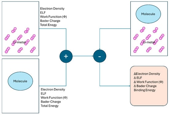 Schematic illustration of the computational workflow used to investigate the interaction between electrolyte molecules and a Lim surface. First, the combined system consisting of the Lim slab and the adsorbed molecule is computed. Then, the isolated components (the clean Lim slab and the free molecule) are calculated separately.