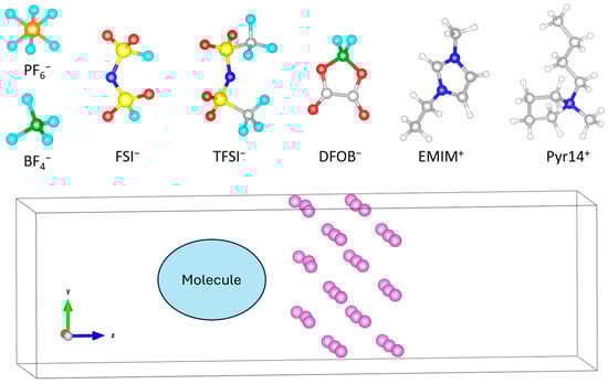 All ab initio calculations simulations are performed using Quantum Espresso (QE) program developed by P. Giannozzi et al. [34,35,36], under the Born−Oppenheimer approximation [37], The electronic structure was described using the Perdew−Burke−Ernzerhof (PBE) functional [38,39]. All simulation boxes are calculated using periodic boundary conditions (PBC) with a plane wave energy cutoff of 40 Ry and 27 k-points for the k-mesh within a projector-augmented wave approach (PAW) [40]. The initial molecule configurations were optimized with GAMESS [41]. Snapshots of the simulation box are obtained using the graphics program visual molecular dynamics (VMD) [42], the Open Visualization Tool (OVITO) designed for post-processing atomistic data [43], and the Visualization for Electronic and STructural Analysis (VESTA) package [44,45]. All simulations were performed in a periodic box of dimensions 10.28 × 10.28 × 35.04 Å3, containing a Lim slab of 36 atoms and a single molecule; in the present study, we examined seven different molecules (PF6, BF4, FSI, TFSI, DFOB, EMIM, and PYR14), optimizing multiple orientations of each molecule as it approached the Lim surface (Figure 2).