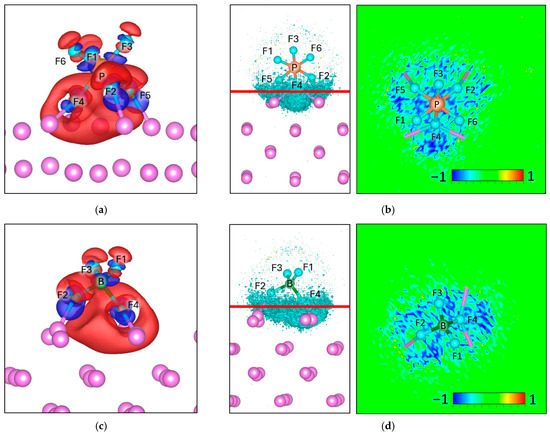 For PF6, given its symmetry, only one stable adsorption geometry is identified, in which atoms F2, F4, and F5 are located at bonding distance from the Lim surface. To gain insight into the interfacial electronic interactions, we first analyze the charge density difference maps (Δρ), which highlight the redistribution of electrons upon adsorption. In these maps, positive values (blue regions) indicate electron accumulation, whereas negative values (red regions) denote electron depletion. We observe pronounced electron accumulation between F2, F4, and F5 and the Li atoms, consistent with the formation of interfacial bonding interactions and enhanced local electron density near the adsorption sites (Figure 3a). The ΔELF reveals a pronounced negative value at the interphase, indicating that the fluorine–lithium interactions have a significant degree of electron delocalization, which may influence the interfacial stability. Notably, is known to dissociate on Lim surfaces, releasing LiF and phosphorus-containing fragments, in agreement with the electronic features observed here [48].