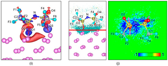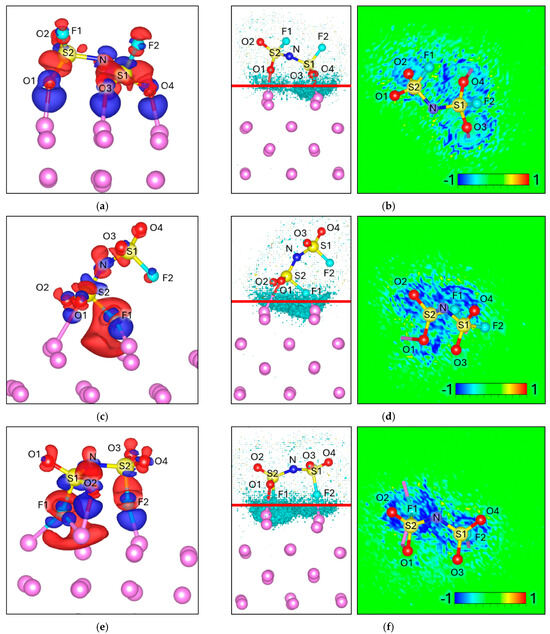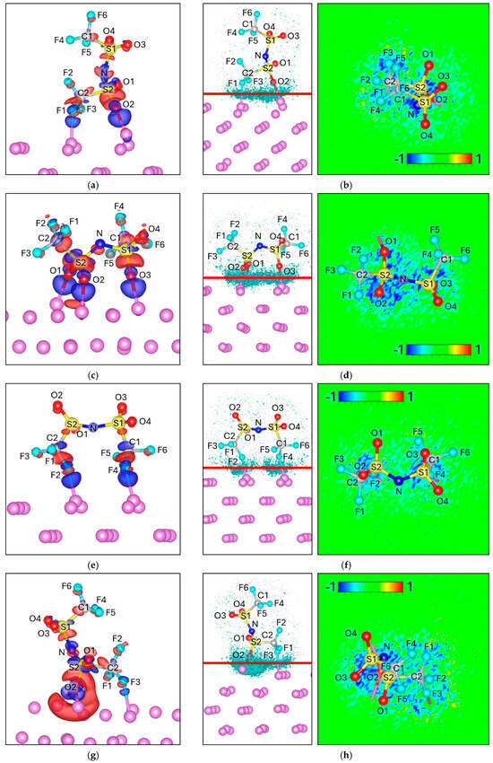 Bader charge analysis (Table 3) corroborates these observations. The total charge of FSI decreases from −1.00 in the isolated state to −1.31 in both the 3O and 2O–F configurations, and further to −1.40 in the 2F configuration, confirming significant interfacial charge transfer. The largest variations occur at the fluorine atoms: for example, F1 becomes much less negative upon adsorption, changing from −1.03 in isolation to −1.09 in the 3O configuration, and from −0.63 to −0.74 in the 2O–F orientation, and from −0.61 to −0.75 in the 2F orientation. F2 also shows systematic changes, decreasing from −1.04 in isolation to −1.06 in the 3O, −1.05 in the 2O–F, and −0.98 to −1.05 in the 2F configuration. In contrast, both sulfur atoms remain nearly unchanged: S1 is constant across all orientations, while S2 varies only slightly (–0.002 to −0.003 e in 3O and 2O–F, and a small increase of +0.016 e in 2F). These trends confirm that fluorine atoms, rather than sulfur, directly accommodate most of the redistributed charge at the Lim interface.