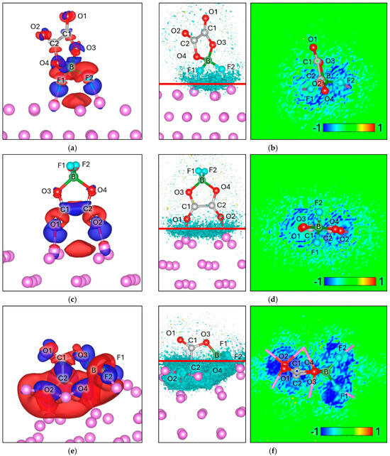 In the 2F Attack configuration, the net charge of the anion decreases from −1.00 in isolation to −1.19 upon adsorption, corresponding to an interfacial charge transfer of −0.19 e. The Δρ maps show distinct electron accumulation between F1–Lim and F2–Lim (Figure 6a), indicating that both fluorine atoms act as primary anchoring sites to the Lim surface. Simultaneously, electron depletion is observed along the B–F1 and B–F2 bonds, reflecting charge withdrawal from these covalent linkages. Additionally, weaker contributions arise from the oxygen atoms within the oxalate groups. Overall, this redistribution suggests strong F-Li binding accompanied by partial weakening of the B–F bonds, but without evidence of complete fragmentation at the interface.