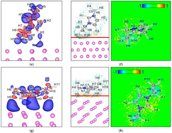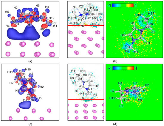 Charge density difference (Δρ) maps for (a) and (c) , with corresponding electron localization function difference (ΔELF) maps for (b) , (d) , on a Lim slab. For charge density the negative values (Δρ < 0) are colored red and correspond to −0.002 e/volume, and the positive values (Δρ > 0) are colored blue and correspond to +0.002 e/volume. For ΔELF, the cyan surface on the left picture corresponds to a value of −0.8, and the red line corresponds to the plane from where the ΔELF 2D map is calculated.