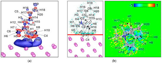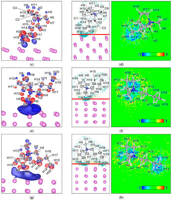 The Δρ maps show electron accumulation (blue) spread broadly over the Lim surface, without being strongly localized on any specific atom or bond, indicating diffuse interfacial charge redistribution (Figure 8a,c,e,g). In contrast, the ΔELF maps reveal modest electron delocalization concentrated near the hydrogen atoms closest to the Li surface (Figure 8b,d,f,h); H2, H5, H9, H11 in 4H Attack; H16, H19 in 2H Attack; H3, H6, H7 in 3H Attack; and H8, H9, H10, H18, H20 in 5H Attack; reflecting weak but discernible bonding interactions. Overall, the ΔELF intensity is moderate: larger than in EMIM+ but smaller than in strongly reactive anions such as DFOB, TFSI, or FSI, and not strongly concentrated on any specific bond or atom, reflecting the overall delocalized interfacial interactions. Bader charge analysis indicates that the net charge of Pyr14 decreases from +1.00 in isolation to values between +0.47 and +0.55 upon adsorption (Table 7). This partial charge neutralization suggests that, while the cation remains structurally intact, it undergoes significant electronic stabilization at the Lim surface without evidence of bond cleavage or chemical fragmentation.