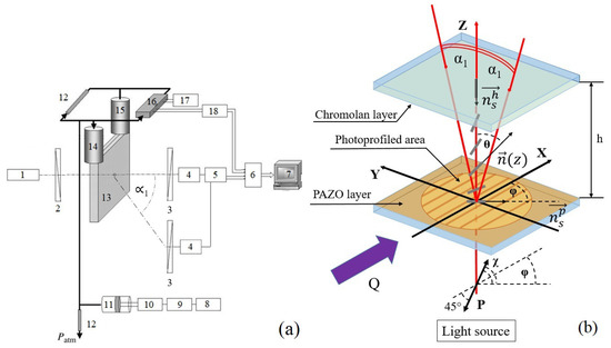 Here, is the wavelength of the laser light, while and are the extraordinary and ordinary refractive indexes, respectively, —distribution of the LC director’s polar angle along Z-axis, . In our case ≈ 65° due to deviations of the polarizer and the director of the liquid crystal on the surface of the PAZO from the direction of the relief grooves (45° and 20°, respectively).