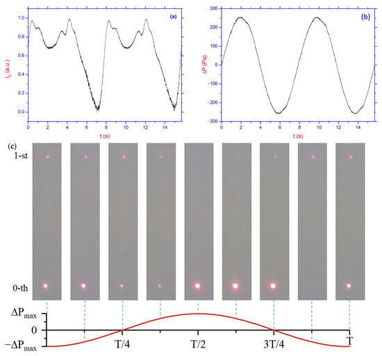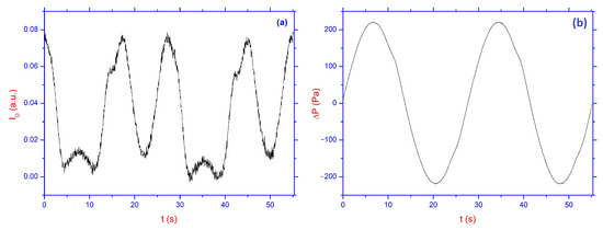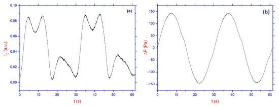 Typical time dependencies of the normalized intensity of the main and first maxima of diffracted light in the absence of the analyzer, as well as time dependencies of the pressure difference with an amplitude value from 0 to 200 Pa are shown in Figure 3a and Figure 4a, as well as in Figure 3b and Figure 4b, respectively. These measured values correspond to the LC cell with a relief height of 360 nm and 180 nm and a frequency of Hz. The quasi-steady flow approximation allows us to analyze all the obtained data, assuming that the maximum change in the intensity of polarized light depends mostly on the value of the maximum pressure difference.