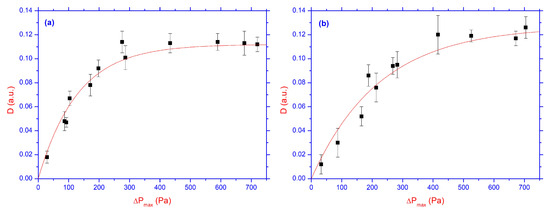 On average, the experiment with each value of the pressure drop amplitude was repeated from 3 to 7 times, which made it possible to analyze the deviations and approximate the obtained results. The solid lines in Figure 5 and Figure 6 described by exponential functions , with , , and , , , and , , , and , , , and , respectively. Here, the number (1) corresponds to Figure 5a, (2) to Figure 5b, (3) to Figure 6a, and (4) to Figure 6b, respectively.