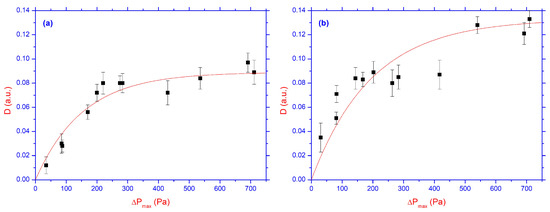 Dependence of the maximum change in the normalized intensity of diffracted light D on the amplitude of the pressure difference . The solid line is the exponential approximation. Here, the relief hight h is equal to 180 nm: (a) is for main maximum, while (b) is for 1st maximum, respectively.