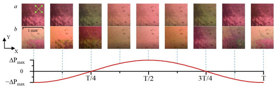 Microscopic polarized images of the LC layer with relief surface in the presence of an oscillating flow at different times with the corresponding oscillation phase. The relief height is 180 nm. The oscillation period T is equal to 9.4 s. Flow plane oriented horizontally. (a) Pa while (b) kPa, respectively.