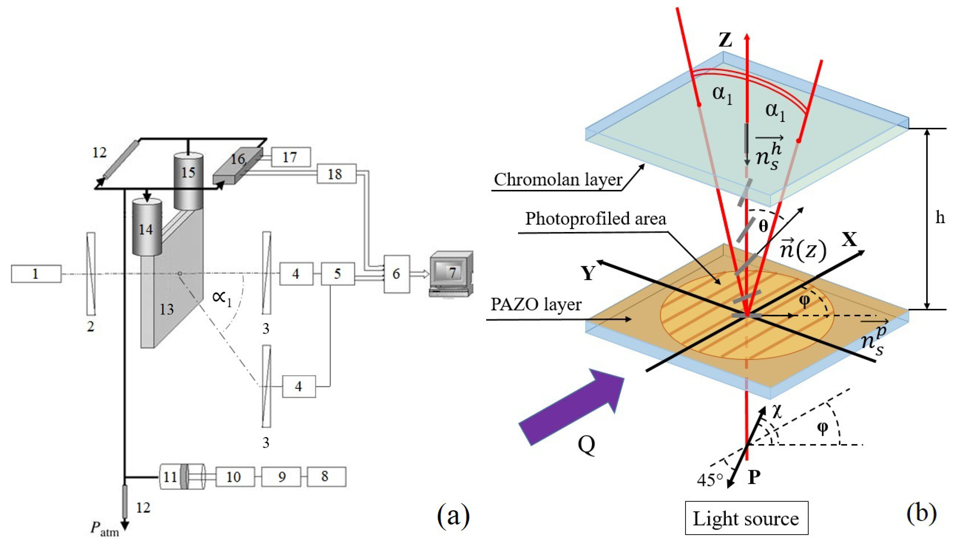 nm); 2—polarizer; 3—analyzer; 4—photodiode; 5—amplifier; 6—ADC; 7—PC; 8–11—mechanical air pressure supply system; 12—capillaries; 13—LC-cell; 14, 15—tubes partially filled with LC; 16–18—pressure sensor with power supply and amplifier [