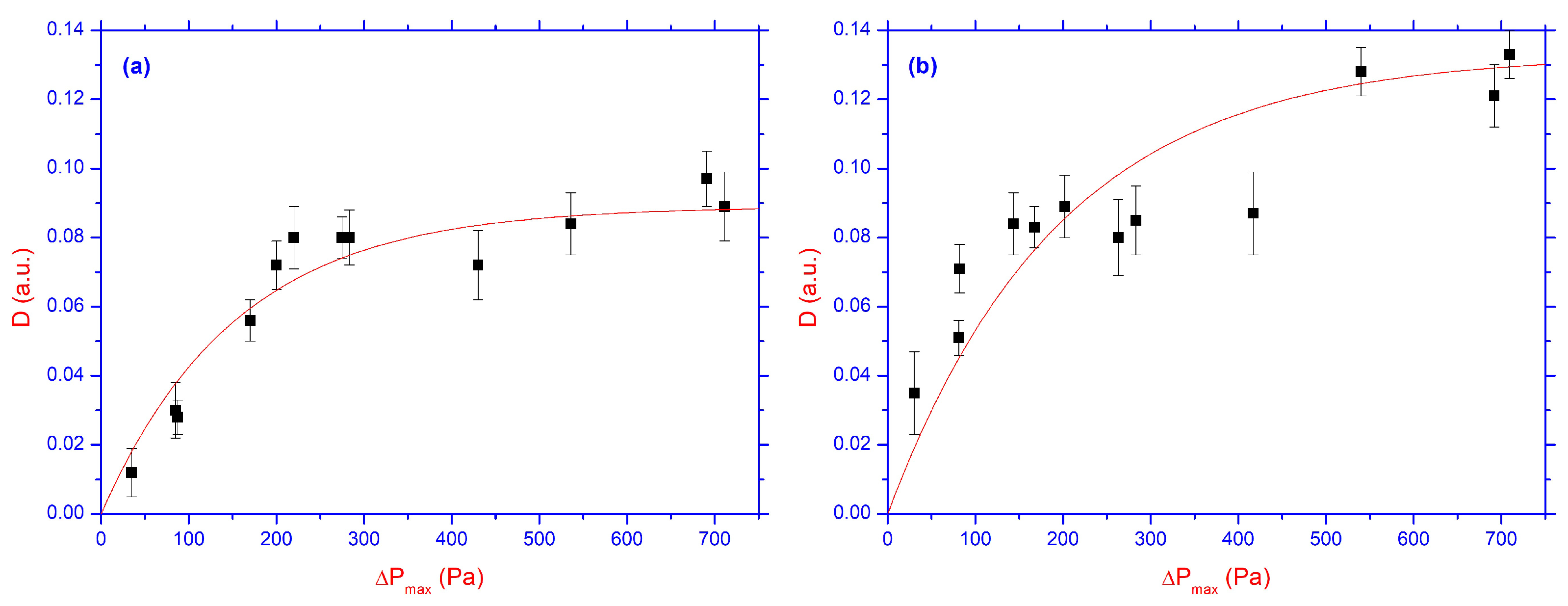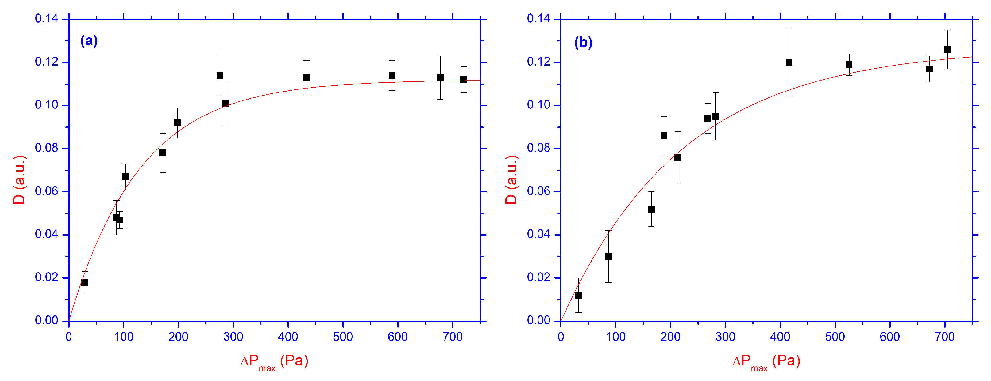 On average, the experiment with each value of the pressure drop amplitude was repeated from 3 to 7 times, which made it possible to analyze the deviations and approximate the obtained results. The solid lines in