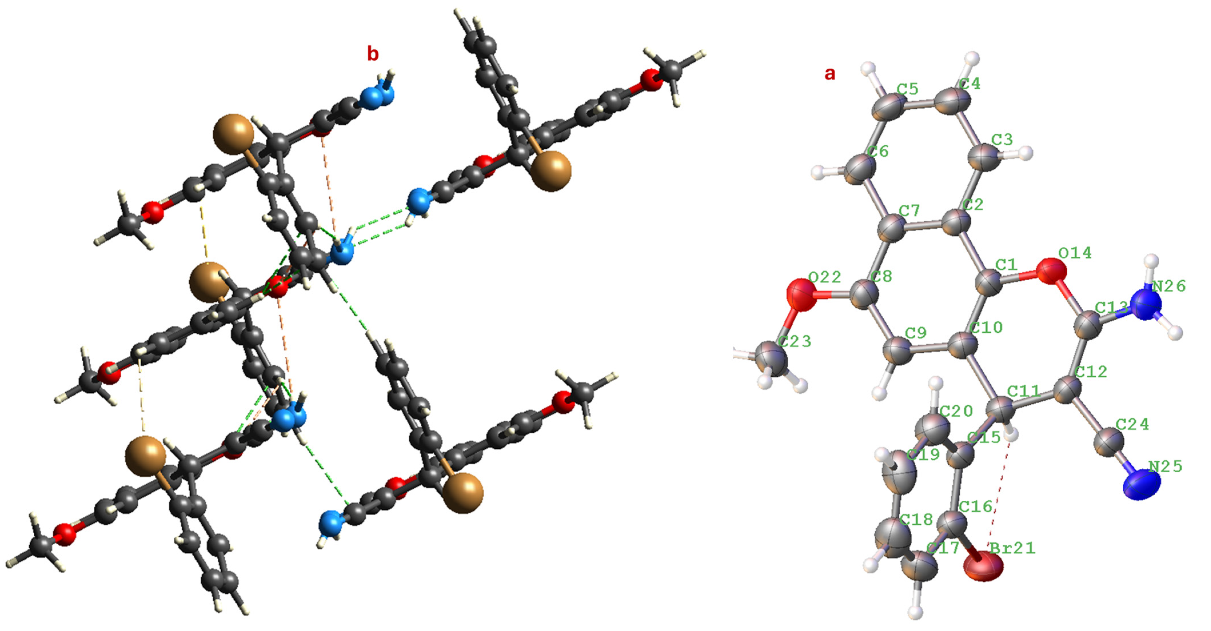 Figure 6). The strongest N–H···N H-interactions are observed between the amino group (N26–H) and the cyano group (C≡N), with energies ranging from –62.6 to –62.0 kJ/mol. These values are consistent with moderate-strength hydrogen bonds, comparable to those found in N–H···O systems. The C–H···Br Halogen Interactions involving the bromine atom (Br21) and C–H bonds exhibit energies of –37.2 to –38.3 kJ/mol, indicating significant stabilizing contributions from halogen bonding. The face-to-face stacking of aromatic rings contributes energies of –19.8 to –10.0 kJ/mol, reflecting the cumulative effect of dispersion forces and dipole–dipole interactions. The Weaker C–H···O interactions between methoxy oxygen atoms (O14, O22) and aromatic C–H bonds contribute –7.0 to –10.0 kJ/mol. The dominance of hydrogen and halogen bonding suggests that directional interactions play a critical role in determining the crystal’s topology, while dispersion forces provide the bulk of cohesive energy (