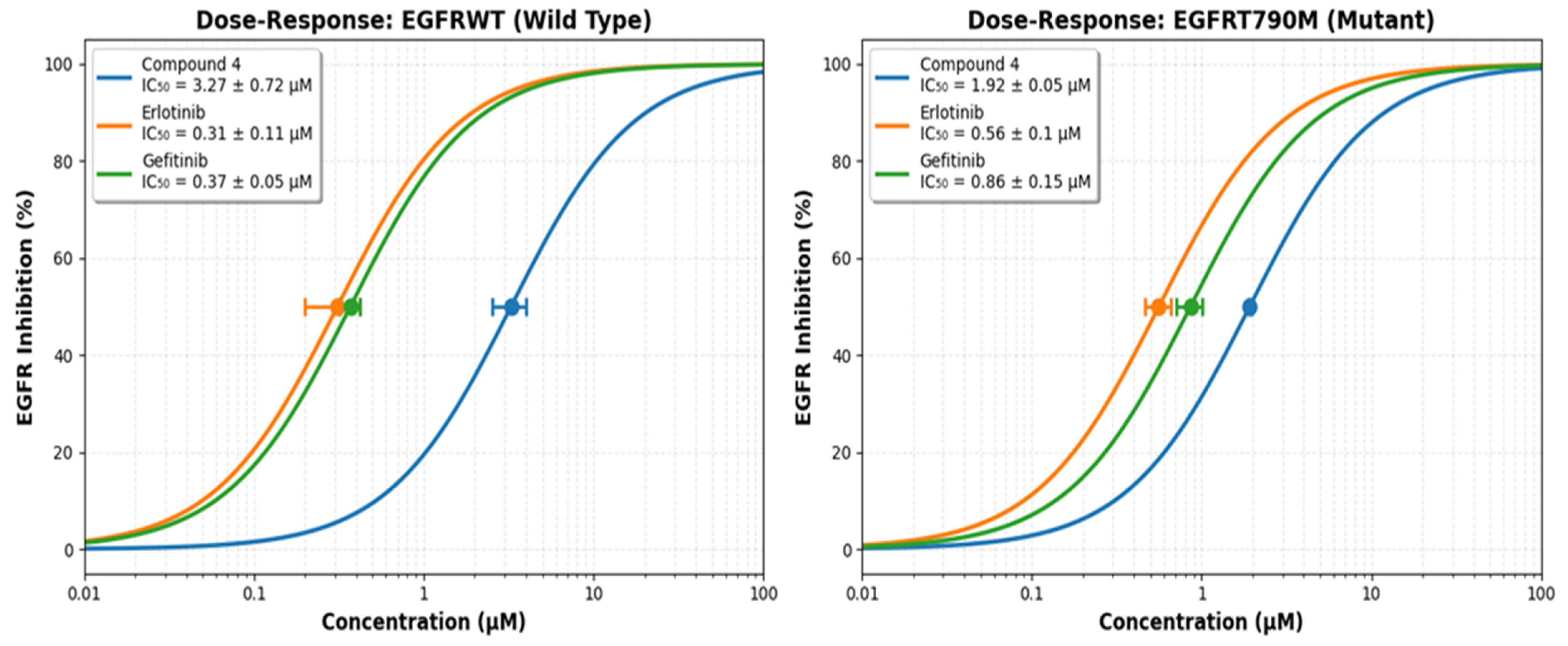 54]. The assay was benchmarked against the first-generation inhibitors Erlotinib and Gefitinib, which served as positive controls to contextualize the potency of the novel compound.