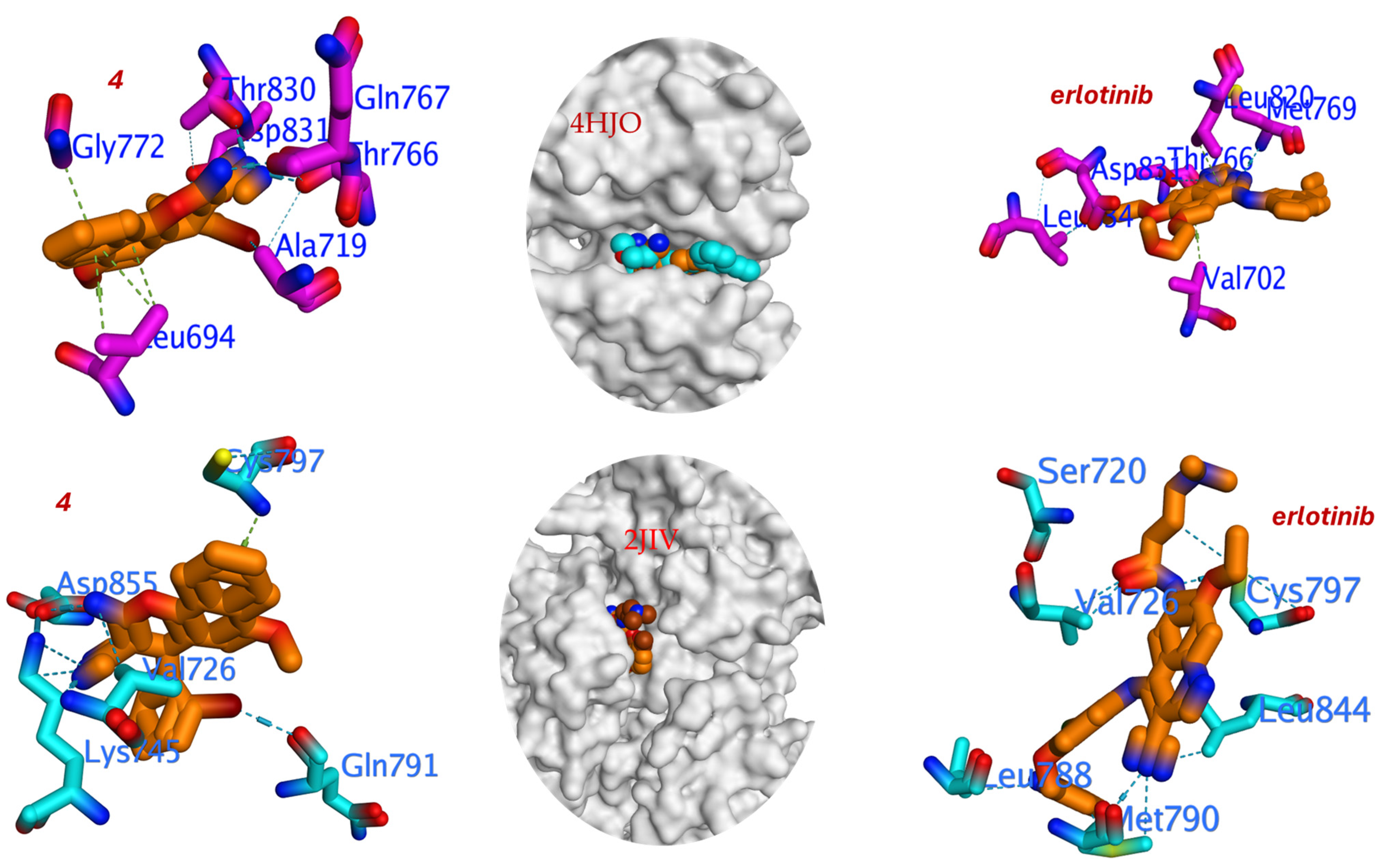 4 is significantly more favorable than that of Erlotinib (H.B = −81.251 kcal/mol), indicating stronger and more numerous hydrogen bonding interactions. This is likely attributable to the presence of the