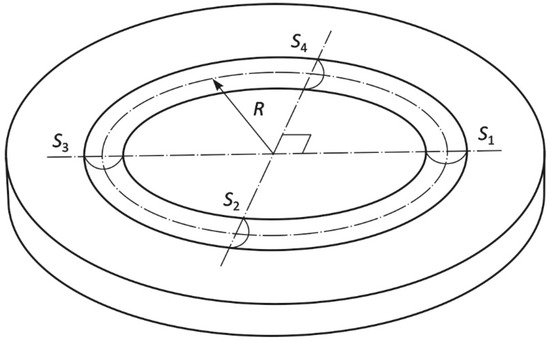 Figure 1 shows the scheme with marked analyzed areas S1–S4 according to ISO 20808 [27]. Fine ceramics (advanced ceramics, advanced technical ceramics)—Determination of friction and wear characteristics of monolithic ceramics by ball-on-disc method [27]. The cross-sectional profiles of the wear track were measured at four positions (S1–S4), spaced 90° apart, using a contact stylus profilometer or similar instrument.