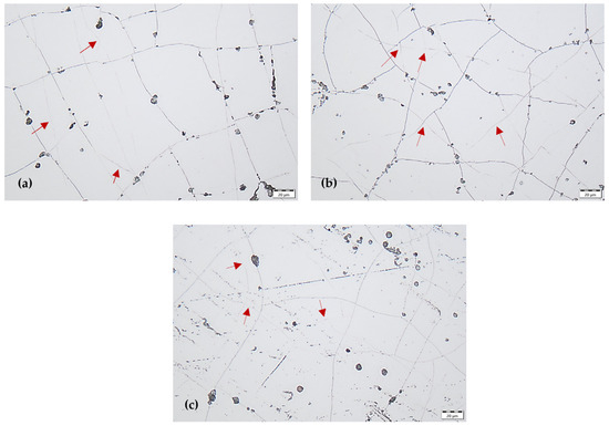 Surface morphology of Cr coating by marking some grain boundaries with arrows, obtained at current density with: (a) 15 A dm−2, (b) 27 A dm−2, (c) 40 A dm−2.