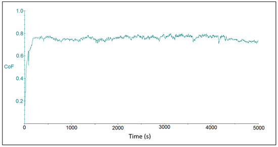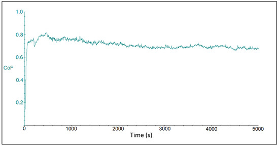 Figure 6 documents the tribo-coefficient of the CR27 sample. As in the previous case, on the CR15 coating, larger friction coefficient oscillations were visible in the first part of the test, for a longer period of about 500 s. The average friction coefficient value during the whole test was at 0.716 ± 0.152.