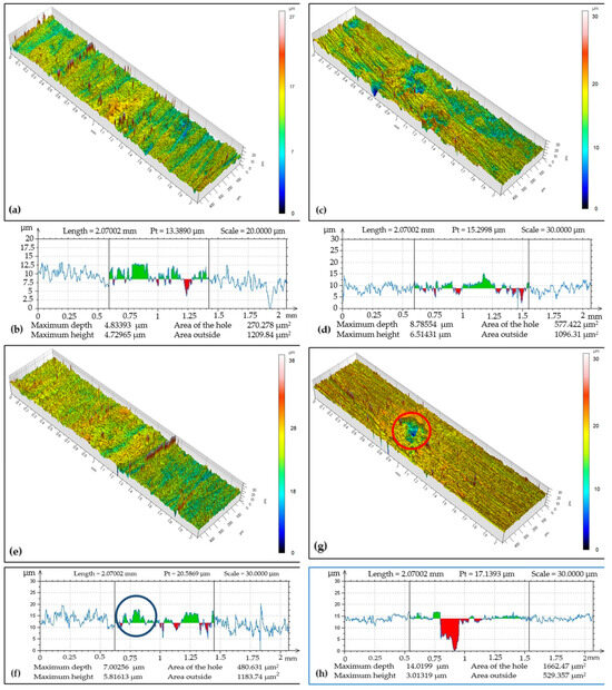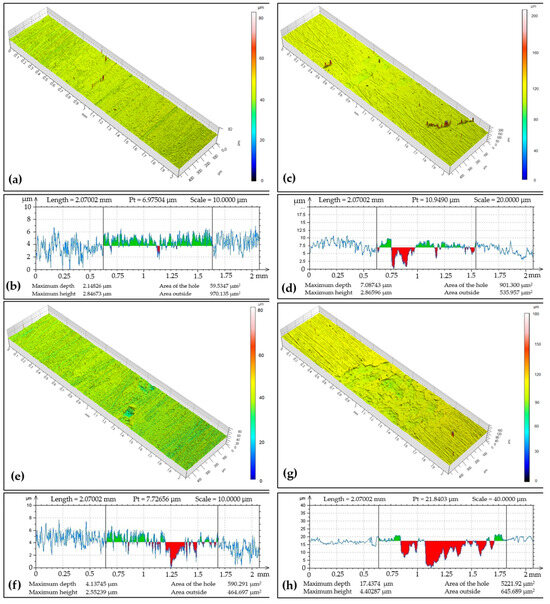 Tribo-track analysis on the CR27 coating at locations S1 to S4 of its surface in Figure 7 showed that the width and max depth of the tribo-tracks were different compared to the CR15 coating. While the track width ranged from 0.82 to 0.98 mm, the tribo-track depth reached a maximum of 14.02 µm at location S4 with a cross-sectional area of 1662.47 µm2 and a minimum of 4.83 µm at the documented location S1 with a cross-sectional area of 270.28 µm2. The wear rate was 4.80 × 10−15 m3 (Nm)−1. The coating was abraded down to the substrate at the analyzed locations. The cross-sectional area (red spot marked in a circle in Figure 7f) characterizes the chromium coating loss and is needed for the calculation of the volume loss w. The increase in the amount of chromium coating (green spot marked in the circle in Figure 7g) in the tribo-track is attributed to the abraded chromium coating that was transferred by the test specimen and adhered to the surface of the tribo-track during adhesive wear.