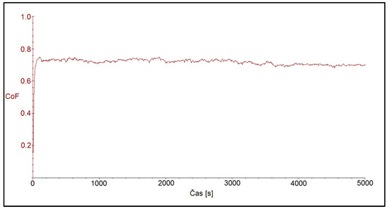 Figure 8 shows the friction coefficient after ball-on-disc test on the CR40 sample. Also in this case, the start of the tribo-test was accompanied by an increase in the friction coefficient in a very short time, less than 100 s, to later steady-state values, which were at 0.710 ± 0.112.