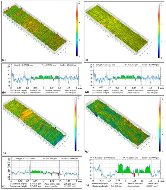 Sample CR40: (a) surface topography at cross-section point S1, (b) topographic curve from S1, (c) surface topography at cross-section point S2, (d) topographic curve from S2, (e) surface topography at cross-section point S3, (f) topographic curve from S3, (g) surface topography at cross-section point S4, (h) topographic curve from S4.