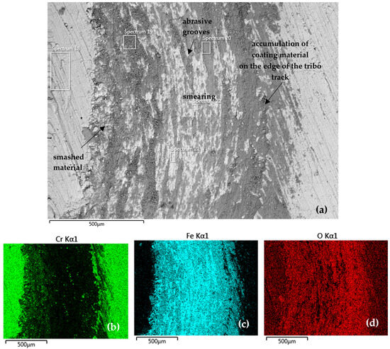 A more detailed analysis of the tribo-track surface with distribution of the analyzed elements was carried out on the SEM microscope using EDS analysis. Figure 10 documents the tribo-track on the CR15 sample surface from the S1 area (as per Figure 5). In the tribo-track center, the smashed coating and substrate material and abrasive grooves can be seen after the contact between the steel tribo-ball and the coating surface. At the tribo-track edges there is a mix of coating (Cr) and steel substrate (Fe and Si) materials. During the tribo-test, tribo-oxides were formed and thus oxygen is also part of the surface, as confirmed by the EDS map of elemental distribution in Figure 10d.