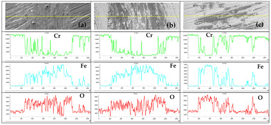 Distribution course of the analyzed elements Cr, Fe and O on the tribo-track surface at S1 location on the sample: (a) CR15, (b) CR27, (c) surface at S2 location on CR40.