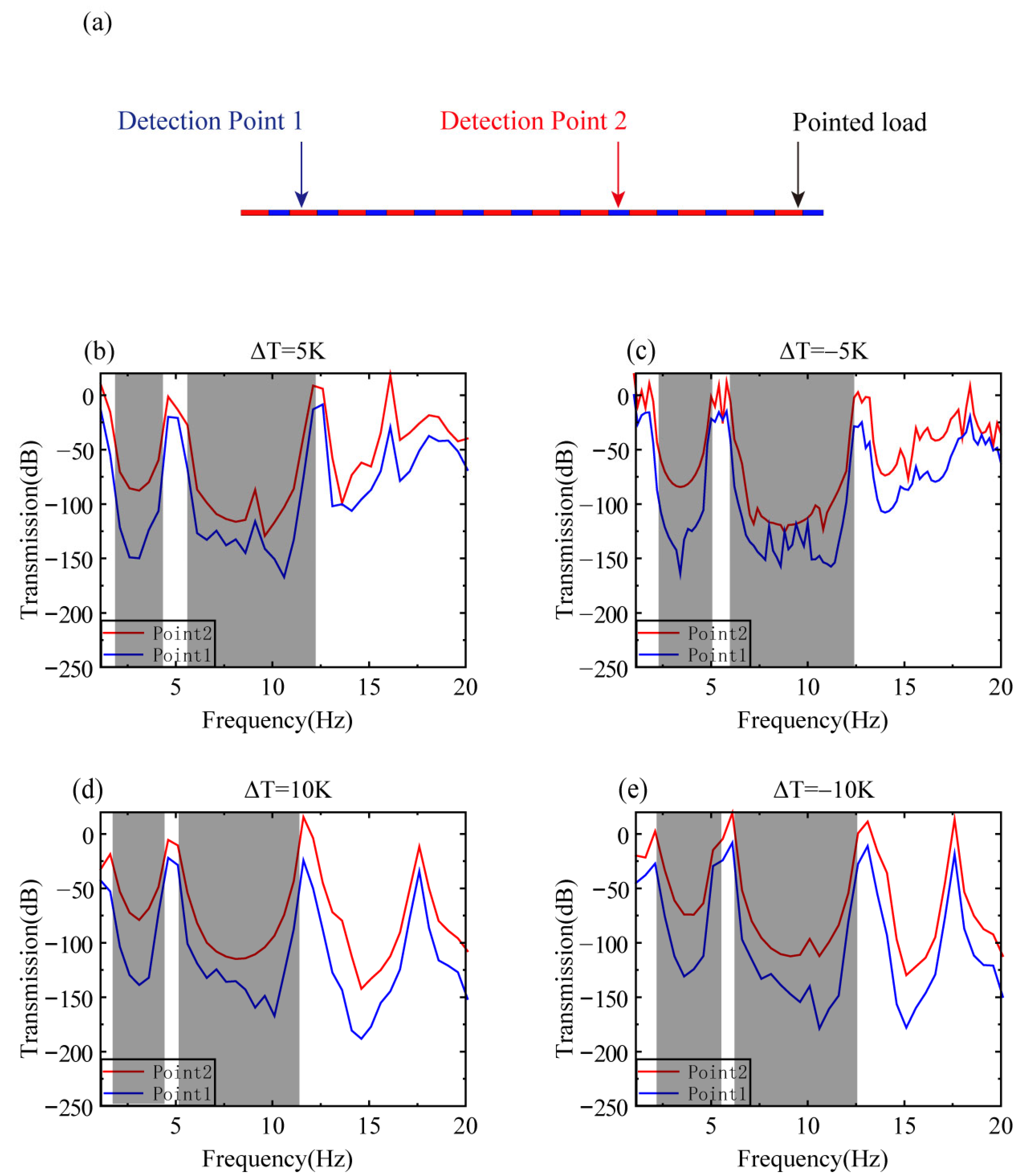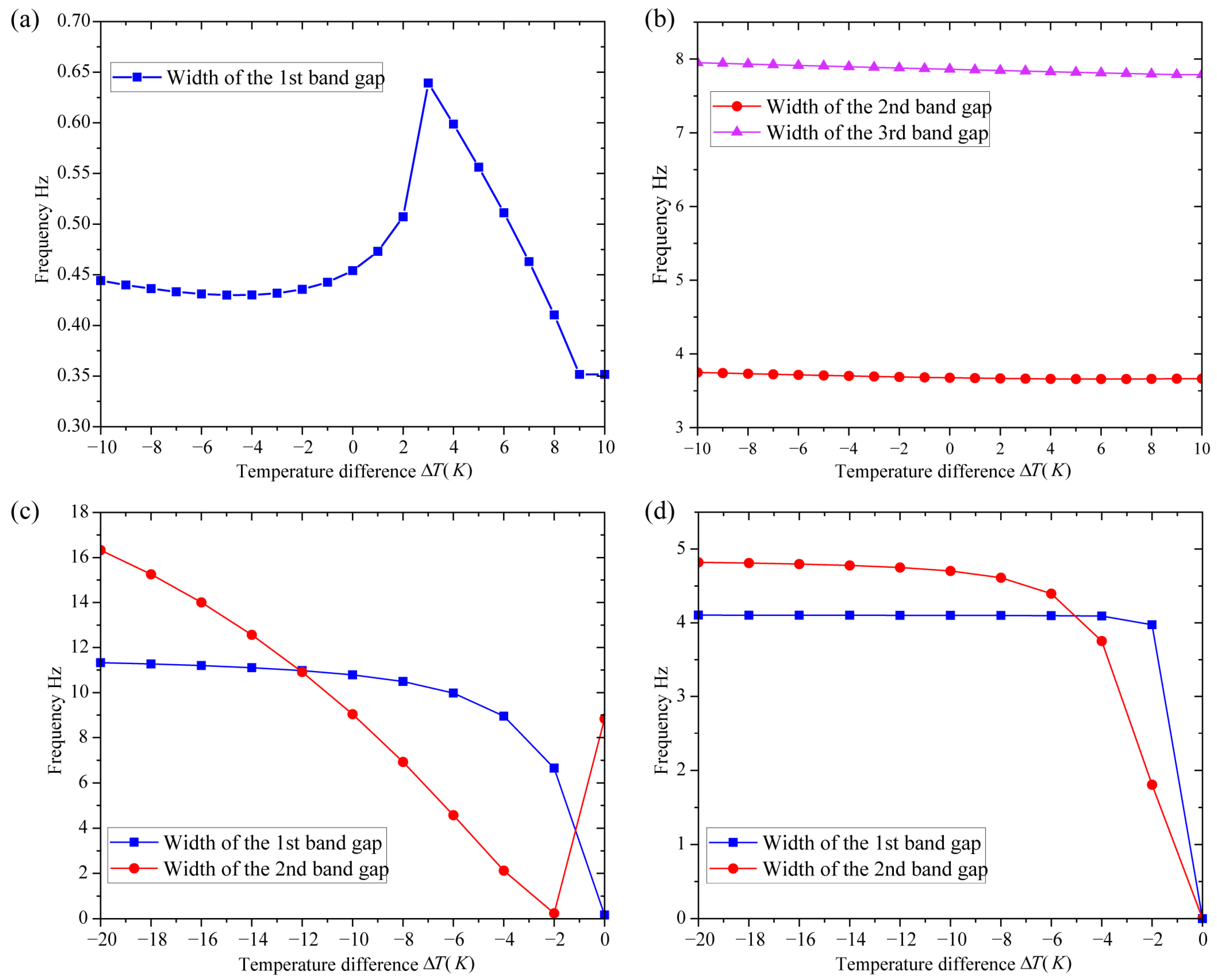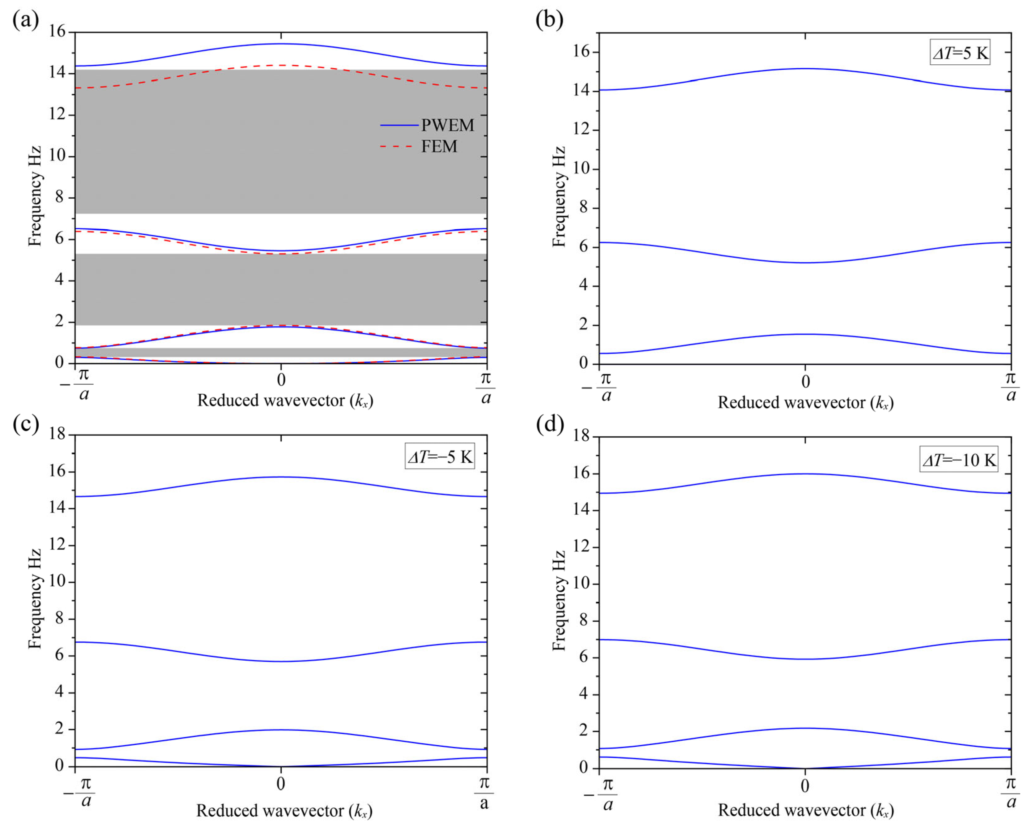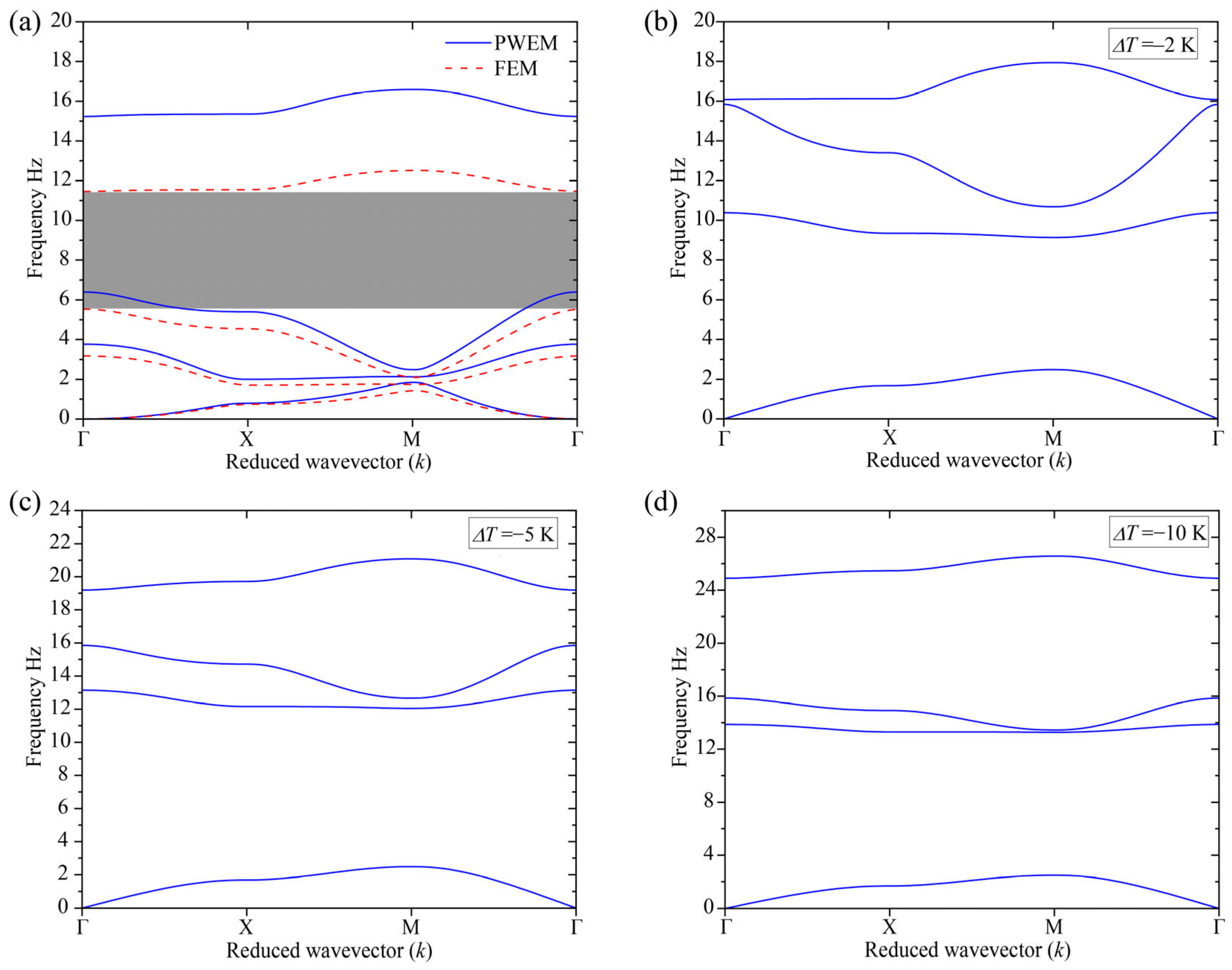 - Li, Z.; Wang, X.; Li, Y.M. The band gap variation of a two dimensional binary locally resonant structure in thermal environment. AIP Adv. 2017, 7, 015002. [Google Scholar] [CrossRef]