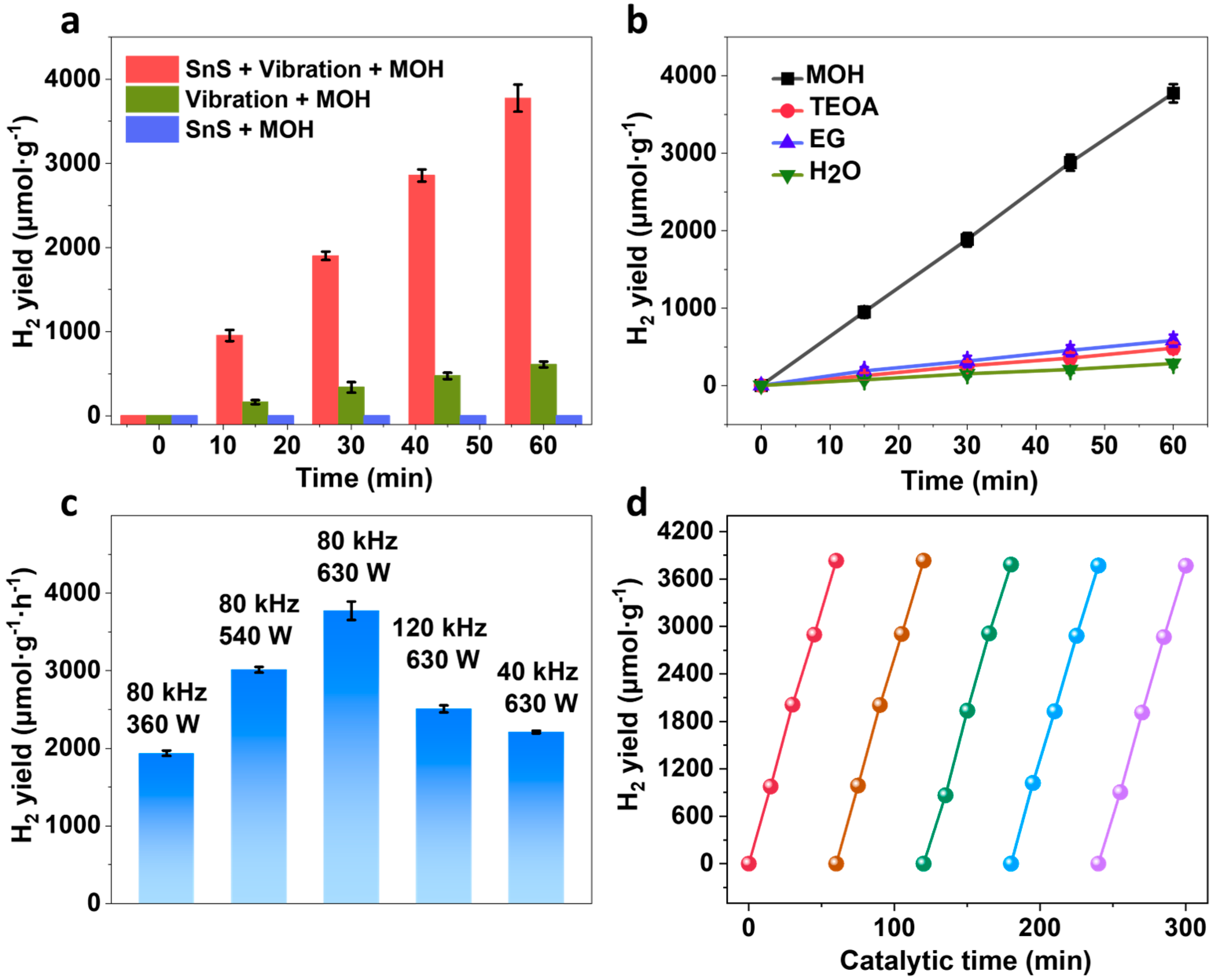 | Mechano- catalysis | SnS (This work) | 630 W, 80 kHz vibration | MOH (aq) | CO: 3889 μmol g−1 h−1 |