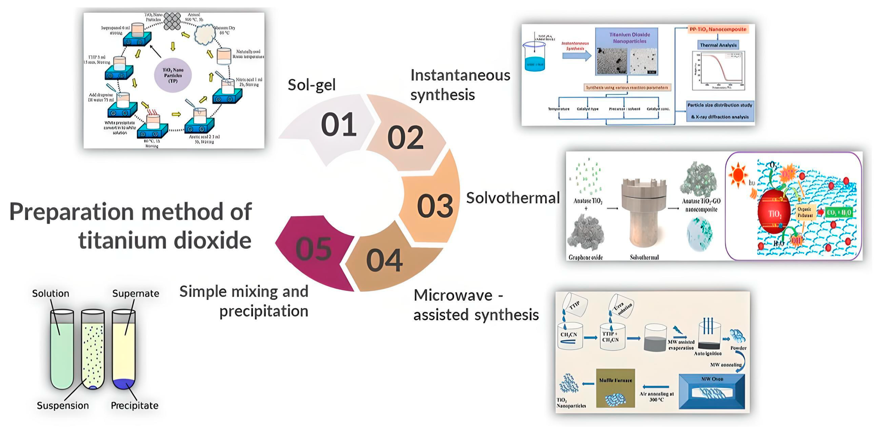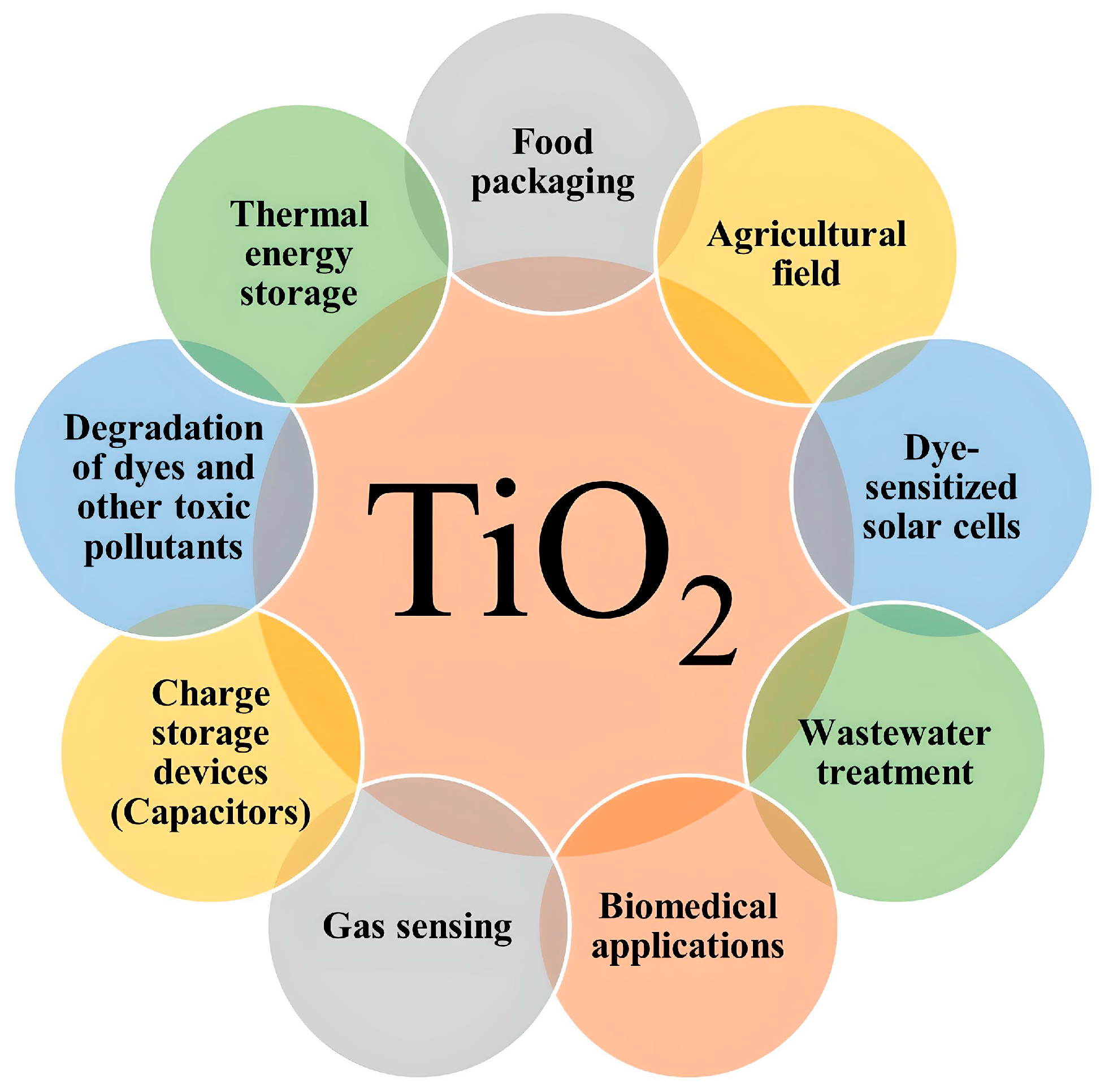 - Chandoliya, R.; Sharma, S.; Sharma, V.; Joshi, R.; Sivanesan, I. Titanium Dioxide Nanoparticle: A Comprehensive Review on Synthesis, Applications and Toxicity. Plants 2024, 13, 2964. [Google Scholar] [CrossRef]