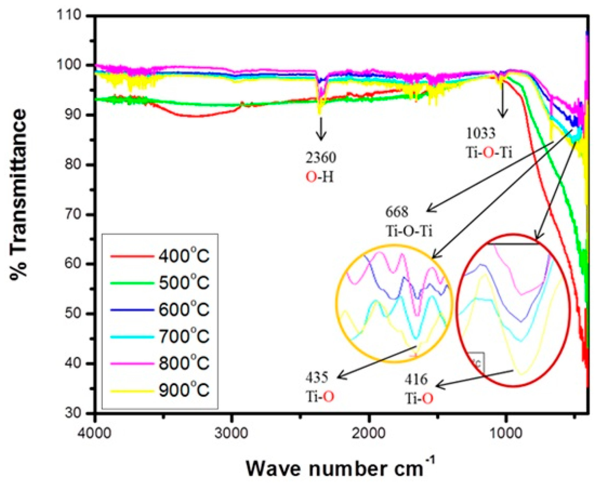 - Waweru, G.S.; Kiprotich, S.; Waithaka, P. Effects of Growth Temperature on the Structural and Optical Properties of Synthesized Titanium Dioxide Nanoparticles. Am. J. Mater. Sci. 2024, 14, 12–20. [Google Scholar]