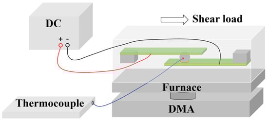 To apply a load under current, this study employed a dynamic mechanical analyzer (DMA, Q800) (TA Instuments, New Castle, DE, USA) for shear testing (see Figure 2), with a constant DC voltage and constant current power supply (KRT-3010). The fixture span was maintained at 18.0 mm, and all tests were conducted at 25.0 °C. Samples were secured in an electrically insulated fixture, followed by furnace closure and current application after thermal stabilization. Current densities ranging from 0 to 4.25 × 103 A/cm2 were applied for 3 minutes to establish thermal equilibrium before initiating shear loading at 1.0 N/min. Data acquisition continued until specimen failure.