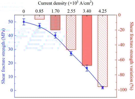 An assessment of current-induced deterioration was conducted through comparative analysis of shear fracture strength with and without electrical loading across different current densities. The results are shown in Figure 5. A similar trend was observed between the shear strength and its variation rate. Specifically, the variation rate exhibited a pronounced reduction from −5.63% to −95.75% with increasing current density over the range of 0.85 × 103 A/cm2 to 4.25 × 103 A/cm2.