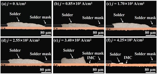 To further examine the fracture mechanism of the solder joints, cross-sectional observations of the fracture surfaces were conducted, with results shown in Figure 7. In the absence of electrical current, the fracture occurred at a distance from the Cu pad that was consistent with the thickness of the solder mask, as shown in Figure 7a. Upon increasing the current density to 2.55 × 103 A/cm2, the fracture characteristics resembled those observed without current application, with no exposed IMC visible (Figure 6d). This indicates that a fracture still occurred within the solder matrix at this current density, as shown in the cross-section of Figure 7d. As the current density was elevated to 3.40 × 103 A/cm2, combining the characterization results from Figure 6e and Figure 7e, a small portion of IMC grains was found to be present on the fracture surface, indicating partial interfacial fracture of the solder joint at this current density. With the current density rising to 4.25 × 103 A/cm2, the Cu layer surface in the fracture was primarily composed of IMC grains with a minor amount of solder. The exposed IMC surface is explained by interfacial fracture, with the scant solder residue accounted for by subsequent melting and coating of the interface. The results demonstrate that the fracture behavior of Cu/Sn-58Bi/Cu joints exhibits significant current density dependence under current loading []. A progressive evolution in fracture mode occurred with increasing current density, manifested as a transition from ductile fracture within the solder to a mixed ductile-brittle failure at the solder/IMC interface, in agreement with the stress-strain curve findings (see Figure 4).