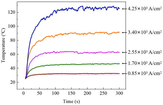 To investigate the mechanism by which the Joule heating effect influences the mechanical shear response of Cu/Sn-58Bi/Cu solder joints, this study systematically measured temperature changes within the solder joints subjected to varying current densities. The effect of Joule heating on the microstructural development and mechanical properties of the solder joint was investigated through combined finite element simulations and experimental analysis. Experimental results indicate that under current densities of 0.85 × 103 A/cm2, 1.70 × 103 A/cm2, 2.55 × 103 A/cm2, 3.40 × 103 A/cm2, and 4.25 × 103 A/cm2, the solder joints’ temperature continuously increased within 100 s of current application before gradually stabilizing to reach a steady-state thermal equilibrium. Figure 8 displays the temperature-versus-time curves for solder joints under different current densities. It can be observed that as the current density increases, the steady-state temperature of the solder joint rises from 30 °C to over 120 °C, approaching the melting point of Sn-58Bi (138 °C). When the current density reaches 0.85 × 103 A/cm2, the solder joint temperature increases by approximately 5 °C within 100 s, ultimately stabilizing around 30 °C. Conversely, upon reaching a current density of 4.25 × 103 A/cm2, the solder joint temperature rose by approximately 95 °C within 100 s, eventually stabilizing above 120 °C. The increase in temperature of the solder joint correlates positively with the current density, as depicted in Figure 9. According to Joule’s law, the heat dissipation QJoule can be expressed as []: