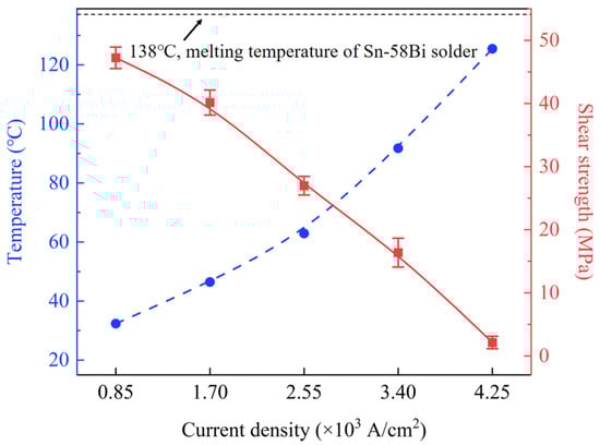 The thermal softening induced by increasing joint temperatures was identified as the primary cause of the marked deterioration in shear strength, as shown in Figure 9. Moreover, as current density increases, the solder joint temperature gradually rises from its initial room temperature (approximately 25 °C). Upon reaching a current density of 4.25 × 103 A/cm2, the solder joint temperature approaches the melting point of Sn-58Bi. This temperature increase, driven by the Joule heating effect, results in thermal softening of the solder matrix. As a result, the solder exhibits a considerable decrease in both yield strength and shear resistance at elevated temperatures [], becoming the primary cause of strength degradation in the high-current range.