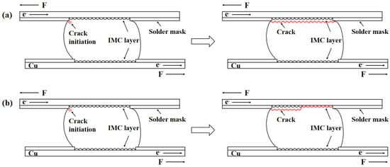 Schematic diagram of fracture locations in Cu/Sn-58Bi/Cu solder joints under current stressing: (a) fracture occurs in solder matrix; (b) fracture occurs at solder/IMC interface.