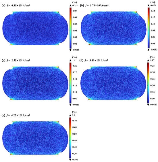 Distribution of equivalent strain in Cu/Sn-58Bi/Cu solder joints at different current densities: (a) j = 0.85 × 103 A/cm2; (b) j = 1.70 × 103 A/cm2; (c) j = 2.55 × 103 A/cm2; (d) j = 3.40 × 103 A/cm2; (e) j = 4.25 × 103 A/cm2.