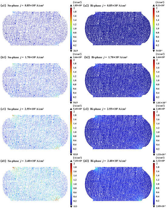 Distribution of current density in Cu/Sn-58Bi/Cu solder joints at different current densities: (a1) j = 0.85 × 103 A/cm2 (Sn-phase); (a2) j = 0.85 × 103 A/cm2 (Bi-phase); (b1) j = 1.70 × 103 A/cm2 (Sn-phase); (b2) j = 1.70 × 103 A/cm2 (Bi-phase); (c1) j = 2.55 × 103 A/cm2 (Sn-phase); (c2) j = 2.55 × 103 A/cm2 (Bi-phase); (d1) j = 3.40 × 103 A/cm2 (Sn-phase); (d2) j = 3.40 × 103 A/cm2 (Bi-phase); (e1) j = 4.25 × 103 A/cm2 (Sn-phase); (e2) j = 4.25 × 103 A/cm2 (Bi-phase).
