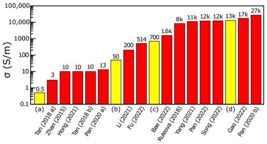 Comparison of the room temperature electrical conductivity σ of undoped polycrystalline materials in various doping studies. The red columns represent literature data of undoped materials prepared by solid-state reactions at high temperature. The yellow columns represent our measured data from a batch of synthesized Bi2O2Se with the presented low-temperature method hot-pressed at 730 °C and 70 MPa ((a) <35 μm fraction, Si3N4 die; (b) all fractions, Si3N4 die; (c) 35–340 μm fraction, Si3N4 die; (d) all fractions, graphite die). The numbers above the columns are approximate values of room temperature electrical conductivity (S·m−1), and the numbers below the columns are citation numbers. The preparation methods used in the cited studies are listed in Table S7. The ‘k’ in the labels denotes ×103. The electrical conductivities of the prepared SPS samples are given in the Supplementary Materials Figures S8 and S9 [10,11,12,13,14,16,17,18,19,24,25,27,29,35].