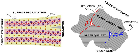 Schematics of the Bi2O2Se crystal structure (left) and grains in the polycrystalline sample (right) showing various processes influencing the properties of the prepared polycrystalline samples. Yellow atoms represent selenium, red atoms oxygen and purple atoms bismuth.