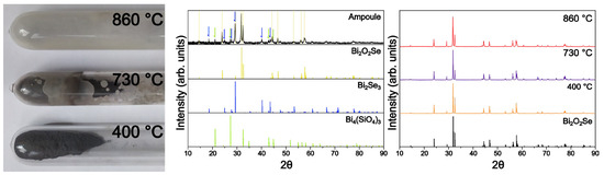 Reaction of Bi2O2Se with SiO2 ampoules. The photo on the left shows the temperature dependence of the reaction rate of Bi2O3 with SiO2 at 400 °C, 730 °C, and 860 °C. In the middle, the XRD pattern of the inner wall of the ampoules shows Bi2SeO5 formed on the ampoule surface. The right XRD pattern shows how products prepared at various temperatures can appear to be XRD pure independent of the reaction with the ampoules and adequately shifted stoichiometry.