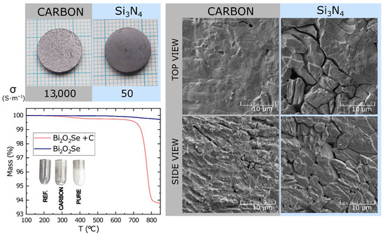 Comparison of optical images, SEM micrographs, thermogravimetry results, and electrical conductivities of pellets hot-pressed at 730 °C in C (graphite) and Si3N4 dies. The SEM images of polished and etched samples pressed in a graphite die show increased BixSey content on the grain surfaces, which is responsible for an increase in electrical conductivity. In contrast, no chemical reduction of Bi2O2Se occurs in a Si3N4 die, resulting in mere particle compaction with no BixSey phase wetting the grain surface. This results in low electrical conductivity even in high-density samples. (A more detailed of the temperature dependence of C reduction is presented in Figure S4a). The onset temperatures of the ongoing reactions are evident in the thermogravimetric measurements.