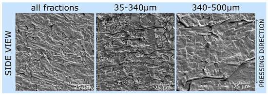 SEM images (100 × 100 μm2) of samples pressed in a Si3N4 die with various particle size fractions. The images show that using a larger particle size fraction allows for better grain alignment within the sample, potentially improving the structural orientation of the material. In contrast, smaller particle sizes result in a more compact sample, which helps prevent the formation of intergranular voids. We also observed a correlation between particle size and electrical conductivity (Figure 1). The samples pressed from larger particles had a higher in-plane conductivity (perpendicular to the pressing direction), whereas those pressed from smaller particles had a lower conductivity. This reduction is likely due to the increased number of grain boundaries and suboptimal grain orientations.