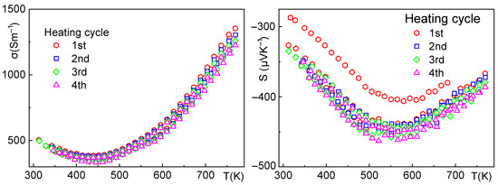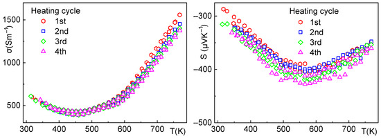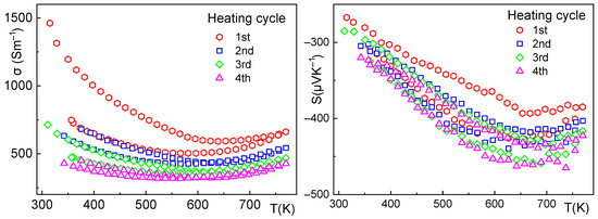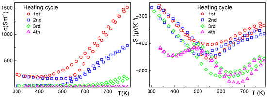 Sample 2—electrical conductivity (left), Seebeck coefficient (right), and the effect of thermal cycling up to 500 °C. The electrical conductivity shows hysteresis during the first cycle, stabilizing after the third cycle at approximately 500 S·m−1 at 300 K. The Seebeck coefficient also shows slight hysteresis during the first cycle.