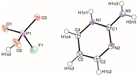 An overview of the amounts of the used reactants for preparation of the title structures is given in Table S1 (Supplementary Materials). Table S2 (Supplementary Materials) contains information about preparation of the related system of 2-aminopyrimidine and H3PO3. All the prepared crystals were colourless and transparent. (C4H6N3)+.(H2O3P)− and (C4H6N3)+.(HFO3P)- seem not to be hygroscopic while forming needles, the length of which was about 1 mm. (C4H6N3)+2·(FO3P)2− is hygroscopic and forms plates of several mm of length. The plates were about 0.3 mm thick. (C4H6N3)+.(HFO3P)− seems to be harder than (C4H6N3)+2·(FO3P)2−.