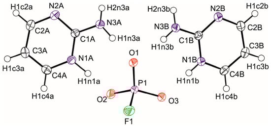 There are known structures where the hydrogen phosphite/phosphite anion can be substituted by the hydrogen trioxofluorophosphate/trioxofluorophosphate, see [,,]. The mixed structures tend to form isomorphic (crystal-chemically isotypic) structures []. Therefore, the hydrogen trioxofluorophosphate anion has been selected for the present study with the hope that the 2-aminopyrimidinium hydrogen trioxofluorophosphate would also be non-centrosymmetric while showing non-linear optical activity. The motivation for the synthesis of the title structures was also supported by the tendency of trioxofluorophosphates to show non-linear optical properties [].