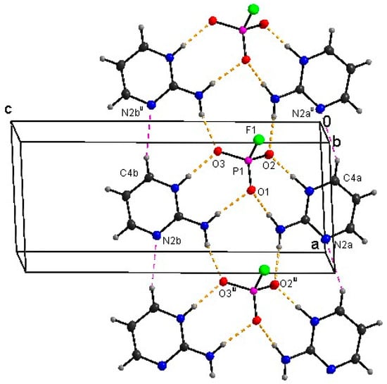 In this motif, the secondary amine groups form shorter N-H···O hydrogen bonds than the primary amine groups (Table 2 and Table 3). This is a general feature as it is indicated by the result of the search in the Cambridge Structural Database []. The search, which was carried out on the structures containing a motif of a potentially substituted 2-aminopyrimidinium cation and the sulfonyl group, offered 53 different structures with 73 motifs; the sulfonyl group was used in this case because it is most similar to the trioxoflurophosphate anion. The results of this search (Figure 5a,b) compare the N···O distances as well as H···O distances for the primary and the secondary amine groups, which are present in each hit. It can be seen in Figure 5a,b that especially the hydrogen bonds of (II) are outliers. This is because of unusually Nprimary···O and Nsecondary···O short hydrogen bonds which measure 2.7779(14) and 2.5810(15) Å for the “a” molecule, respectively, and in the case of the “b” molecule 2.7536(14) and 2.6415(15) Å, respectively. The hits offered by the Cambridge Crystallographic Database [] indicate that the reason for the exceptional position of the title structure in Figure 5a,b is due to a small size of the unsubstituted 2-aminopyrimidinium molecules, which are present in (I) and (II) and which may get closer to the hydrogen trioxofluorophosphate and trioxofluorophosphate molecules than the substituted ones.