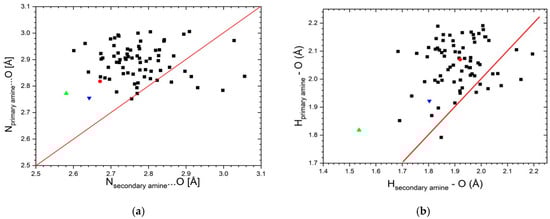 The N-H distances within the primary amine group cannot be well compared because of the frequent occurrence of inaptly applied refinement constraints. Wrong or inapt refinement constraints are often applied in the refinement of the secondary amine and hydroxyl groups; as to the critique, see e.g., []. Thus, the distances in Figure 5b are biased in many cases.