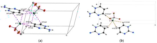 The title structures also contain weak hydrogen bonds []. Despite the chemical difference due to the presence of the O-H···O bond in (I) and its absence in (II), these weak hydrogen bonds are quite similar in either structure: There is quite a short C4-H1c4···N2iv hydrogen bond with quite a large D-H···A angle in (I) (Table 2, Figure 3). This hydrogen bond has counterparts in (II), i.e., C4a-H1c4a···N2av and C4b-H1c4b···N2biv (Table 3, Figure 4). The latter nitrogen atoms in both structures are non-protonated ring N-atoms. Similarly, there are four C-H···F weak interactions in which each F atom is involved as an acceptor of four C-H···F hydrogen bonds in a distorted tetrahedral symmetry (Table 2 and Table 3; Figure 6a,b). In (I), the H1c3 atom is donated to two F atoms (F1 and F1vi). The respective graph set motif R22(4) is formed by the atoms F···H1c3···Fvi···H1c3i. The value of the angle F1···H1c3···F1vi measures 110.6°, i.e., it is close to the tetrahedral angle.