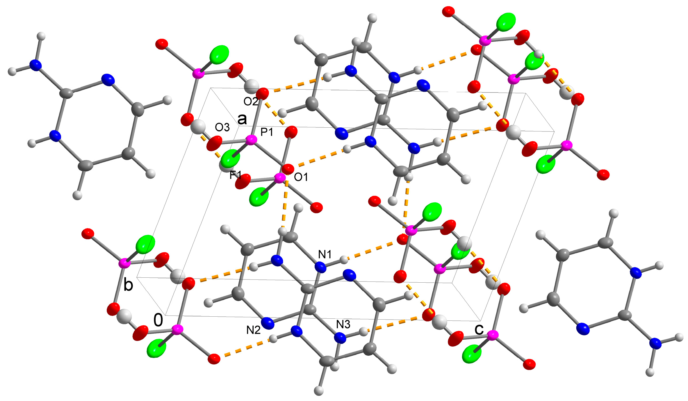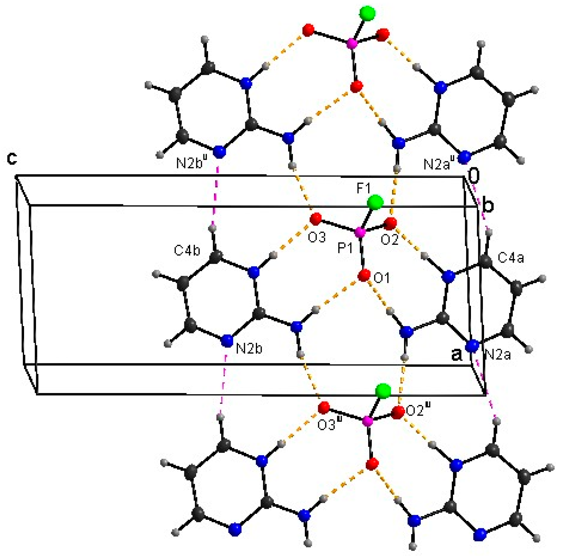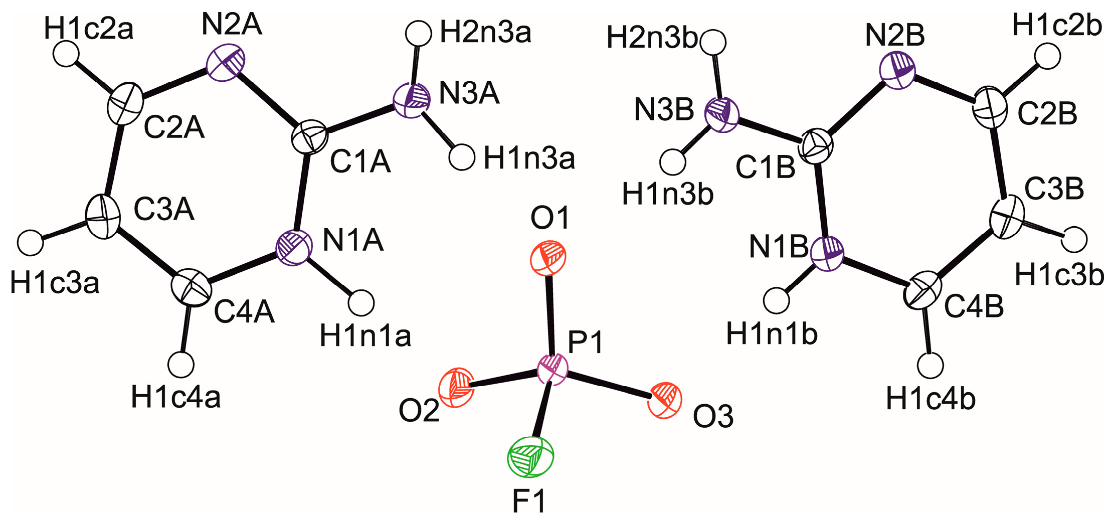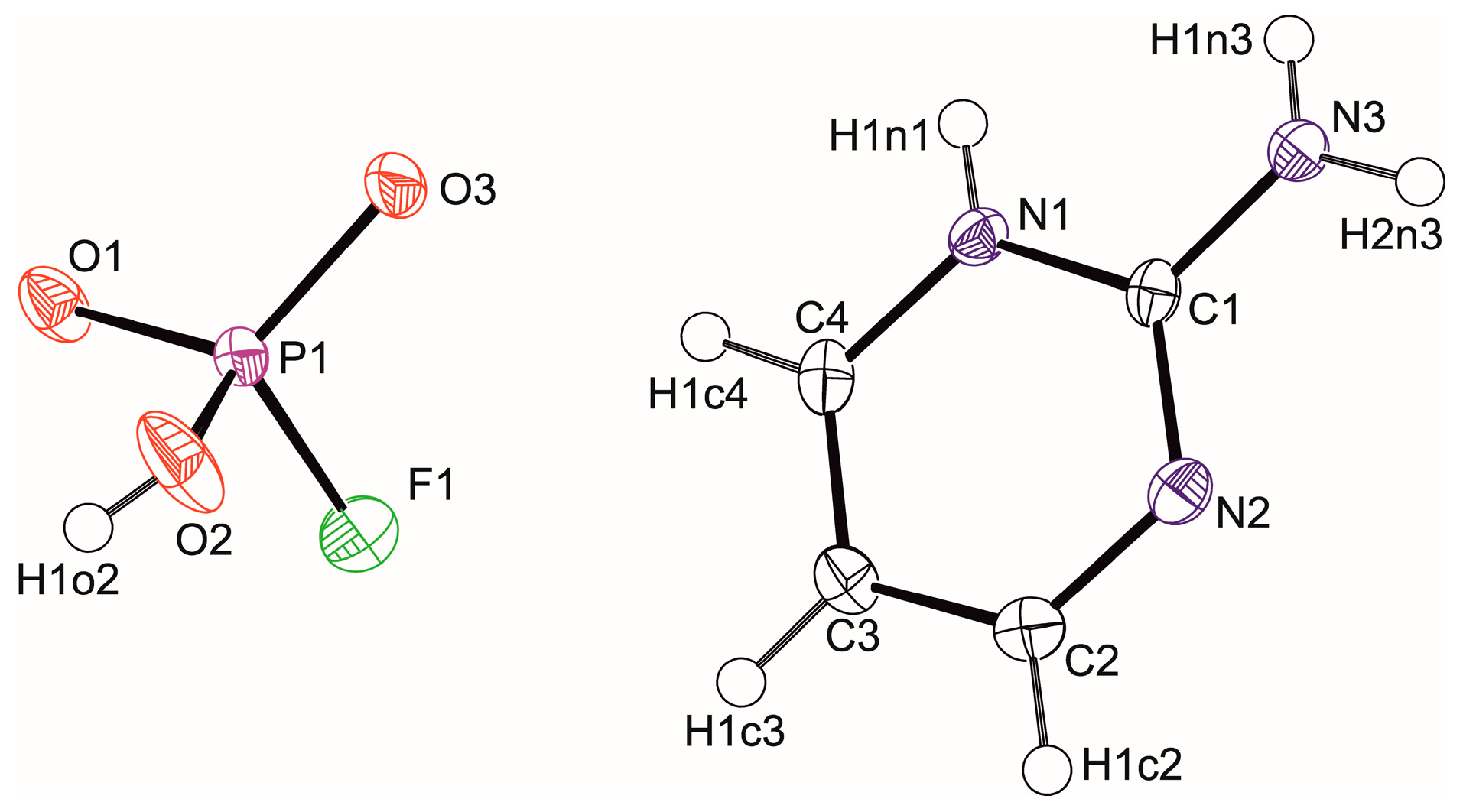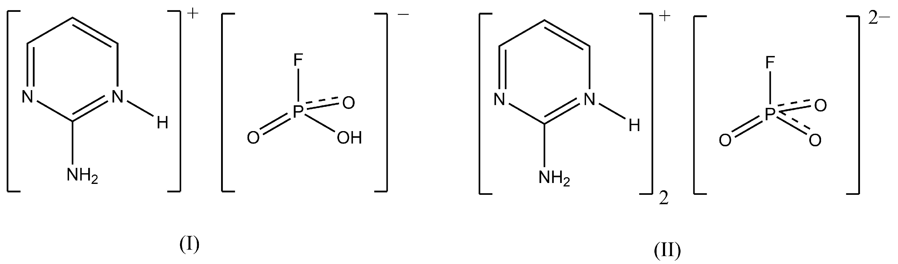 | Chemical name | 2-aminopyrimidinium hydrogen trioxofluorophosphate, (I) | bis(2-aminopyrimidinium) trioxofluorophosphate, (II) |